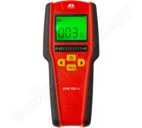 Влагомер ADA ZFM 100-4 — это бесконтактный индуктивный измеритель влаги мягких и твердых пород дерева, гипсокартоне, кирпичной кладке. Прибор измеряет влагу с помощью сенсора, который находится на обратной стороне прибора.