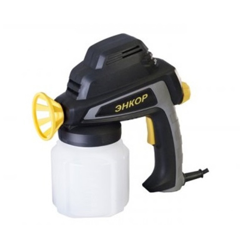 мКраскораспылитель Энкор КЭ-400 50336 со встроенным компрессором имеет бачок для краски объемом 0.9 л, что обеспечивает продолжительный рабочий цикл. Он работает с такими лакокрасочными материалами, как водорастворимые краски, лаки, грунтовки, морилки т .д. Максимальная вязкость рабочего состава не должна превышать 35 DIN/сек.
