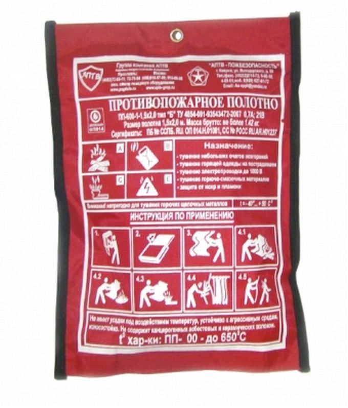 Полотна выполнены в виде прямоугольного отрезка термостойкой ткани площадью 2,25-4,0 кв. метра в соответствии с ППБ 01-93, сложенных в укладку и помещенных в специальные чехлы, которые легко крепятся в любом доступном месте и надежно удерживают полотна в сложенном состоянии, а также позволяют экстренно извлечь и раскрыть его.