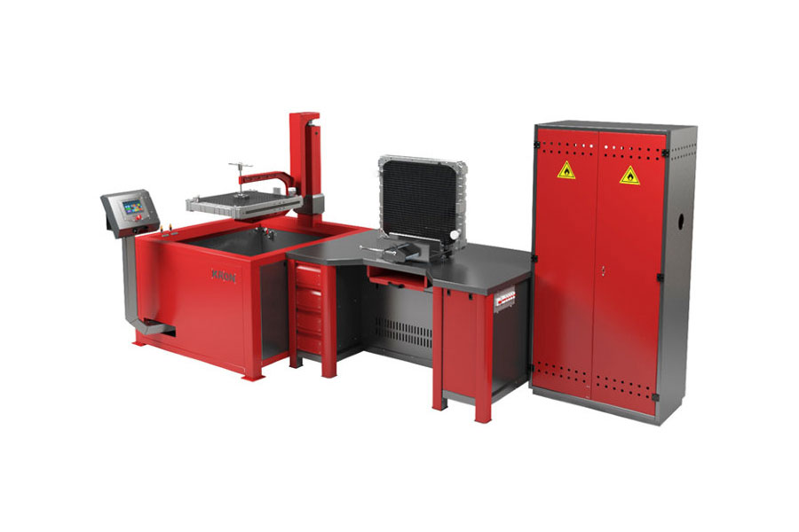 Рабочий стол представляет собой цельносварную конструкцию, в которую встраиваются: компрессор и насосная станция, благодаря которым происходит тестирование радиатора сжатым воздухом и водой. Также стол оборудован тисками, тумбой с выдвижными ящиками для хранения инструментов.